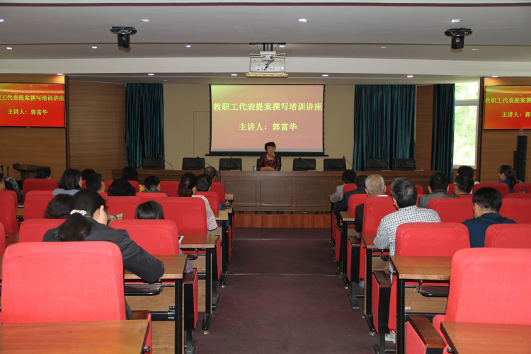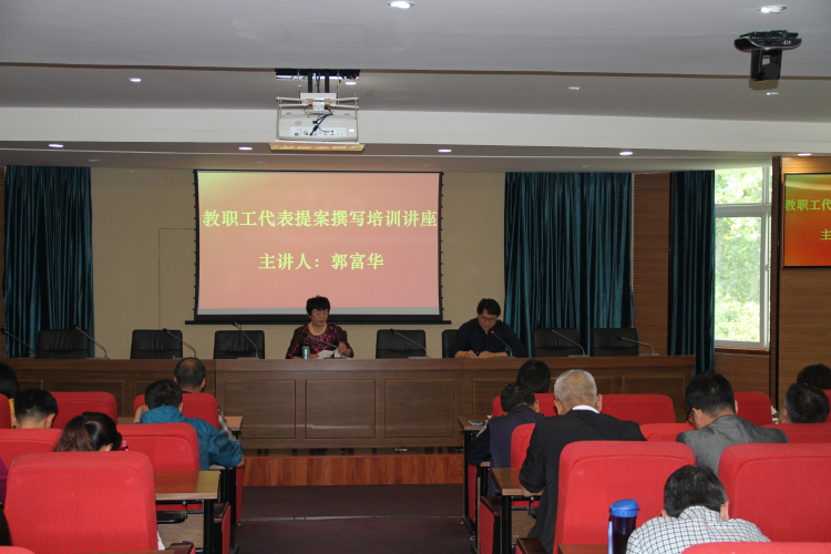 5月9日下午3:00在院行政楼238会议室举办教职工代表提案撰写培训讲座,院工会邀请原河南教育学院党委副书记、工会主席郭富华来院为双代会代表怎样围绕撰写提案及提案工作授课。共有81名双代会代表参加培训,工会主席夏喜利主持并参加了培训。
