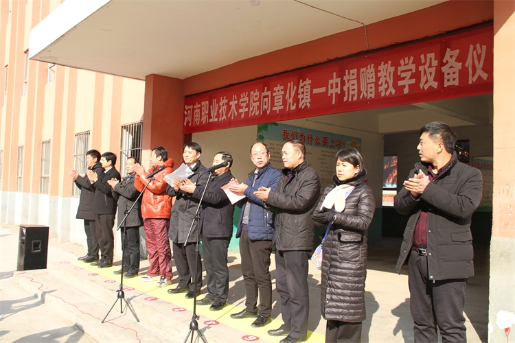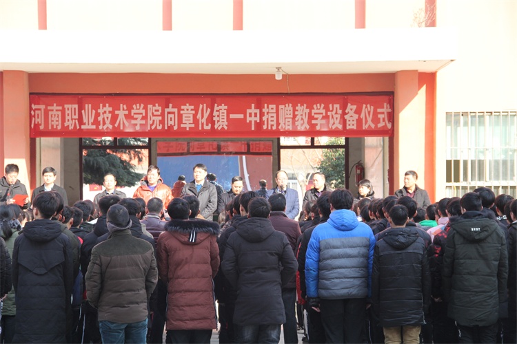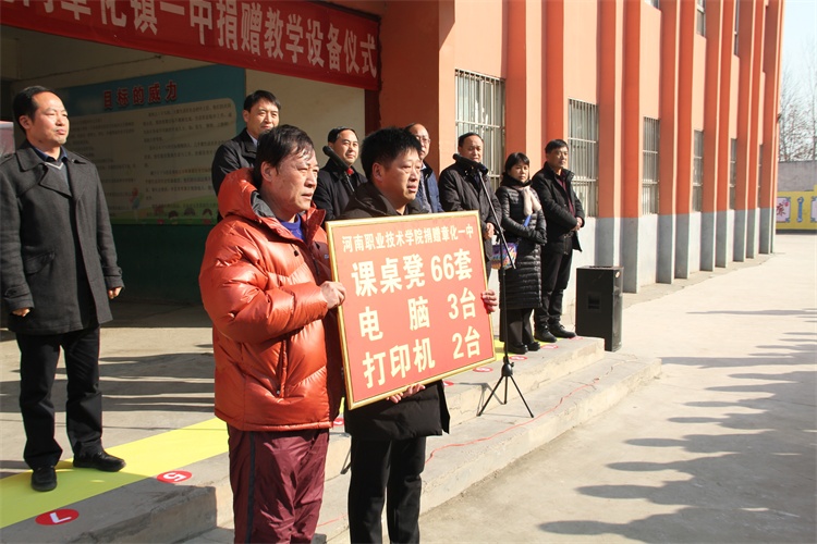 12月12日上午,我校工会向舞阳县章化镇第一初级中学捐赠物品仪式在章化镇第一初级中学举行。我校工会主席夏喜利出席仪式并讲话。校工会、“帮扶”办相关同志出席了捐赠仪式。工会副主席赵燕军代表工会向章化镇第一初级中学捐赠了课桌椅66套、计算机3台、打印机2台。舞阳县政府副县长宋春华,县教育科技体育局,章化镇、章化镇第一初级中学相关领导及部分师生600余人参加了捐赠仪式。