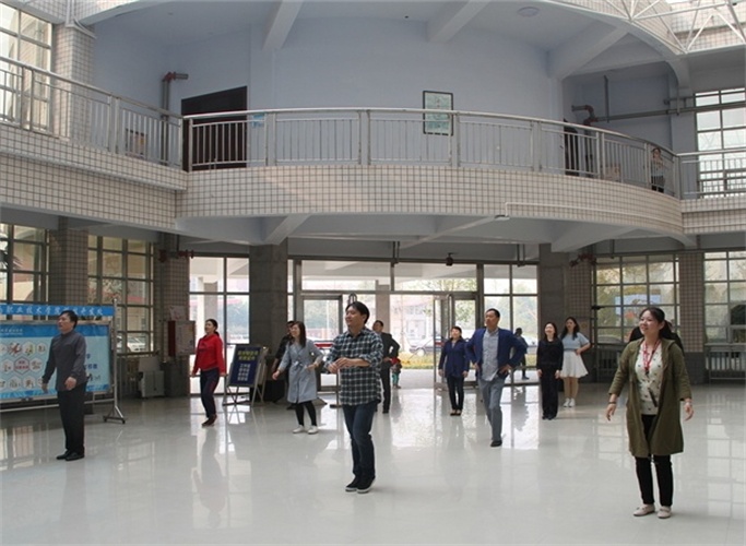 2018年10月15日上午,在行政楼一楼大厅,机关三个分会的教职工随着第九套广播体操的音乐及节拍,积极认真地做好每一个动作。工会主席夏喜利同志亲自参与,共有30多人参加。其他分会在各自地点认真组织做好工间操。(供稿:张军,审稿:赵燕军)