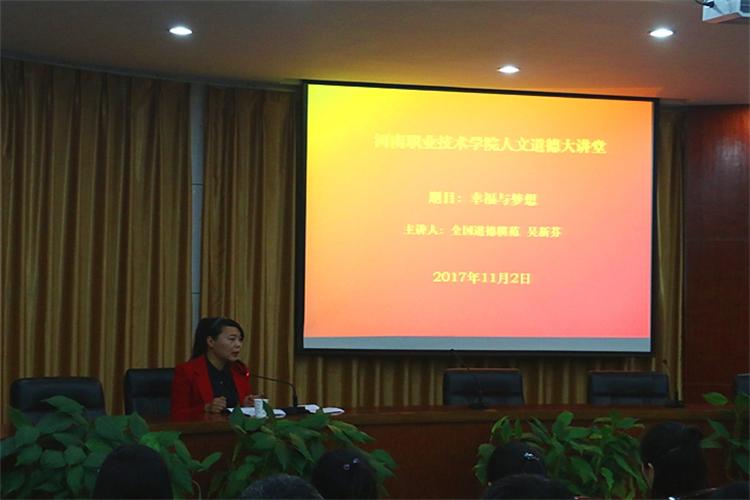 11月2日19点,学院人文道德大讲堂在行政楼二楼圆形会议室举行。全国道德模范、“五一”劳动奖章获得者、禹州妇联副主席吴新芬为学院师生作了题为“幸福与梦想”专题报告。院属17个人分会教职工代表、工会工作人员和工商管理系学生代表共200余人聆听了报告。
