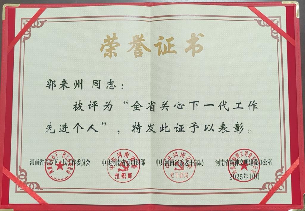 近日,全省关心下一代工作表彰大会在郑州召开。会议深入学习贯彻习近平总书记关于关心下一代工作的重要指示精神,表彰了一批在全省关心下一代事业中作出突出贡献的先进集体和先进个人。我校关工委副秘书长郭来州同志因工作扎实、担当有为,荣获“全省关心下一代工作先进个人”荣誉称号,为学校争得了荣誉。