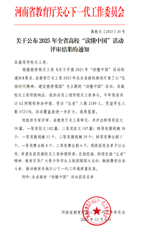 近日,河南省教育厅关工委公布2025年“读懂中国”活动评选结果。我校围绕“弘扬时代精神,建设教育强国”主题推荐的多项作品脱颖而出,并荣获活动表扬单位。
