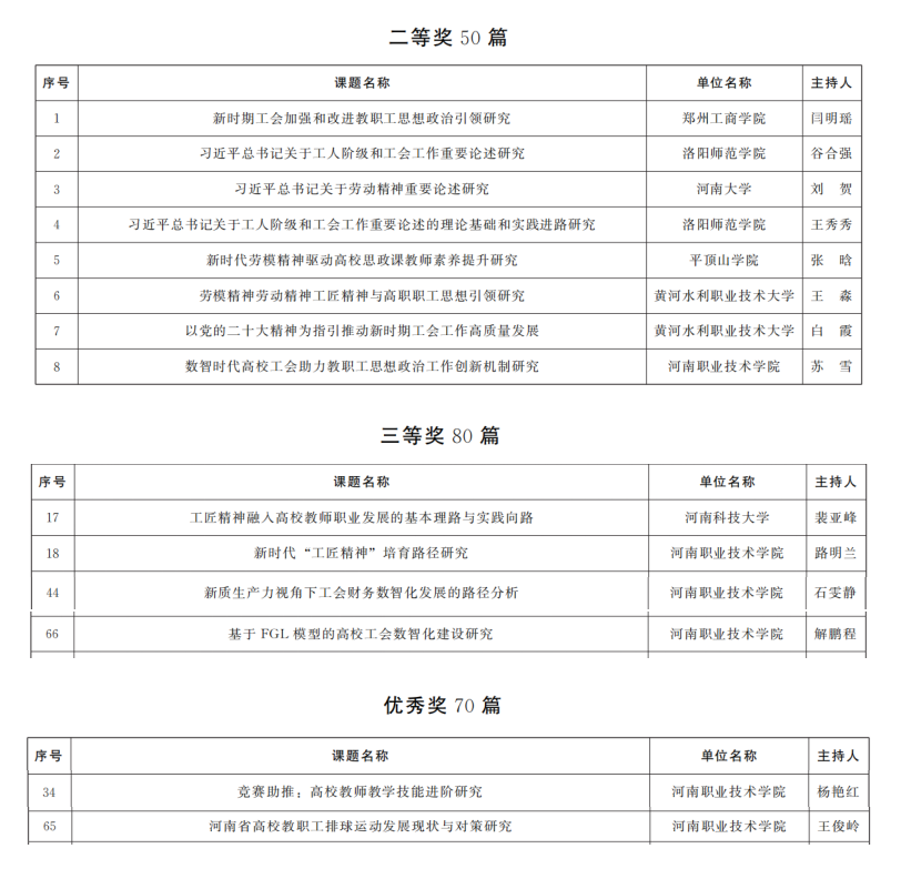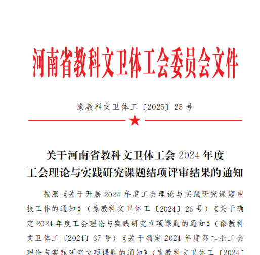 近日,《关于河南省教科文卫体工会2024年度工会理论与实践研究课题结项评审结果的通知》(豫教科文卫体工〔2025〕25号)发布,我校共有6项课题顺利结项并获奖。其中,苏雪的研究课题荣获二等奖;路明兰、石雯静、解鹏程的研究课题荣获三等奖;杨艳红、王俊岭的研究课题荣获优秀奖。
