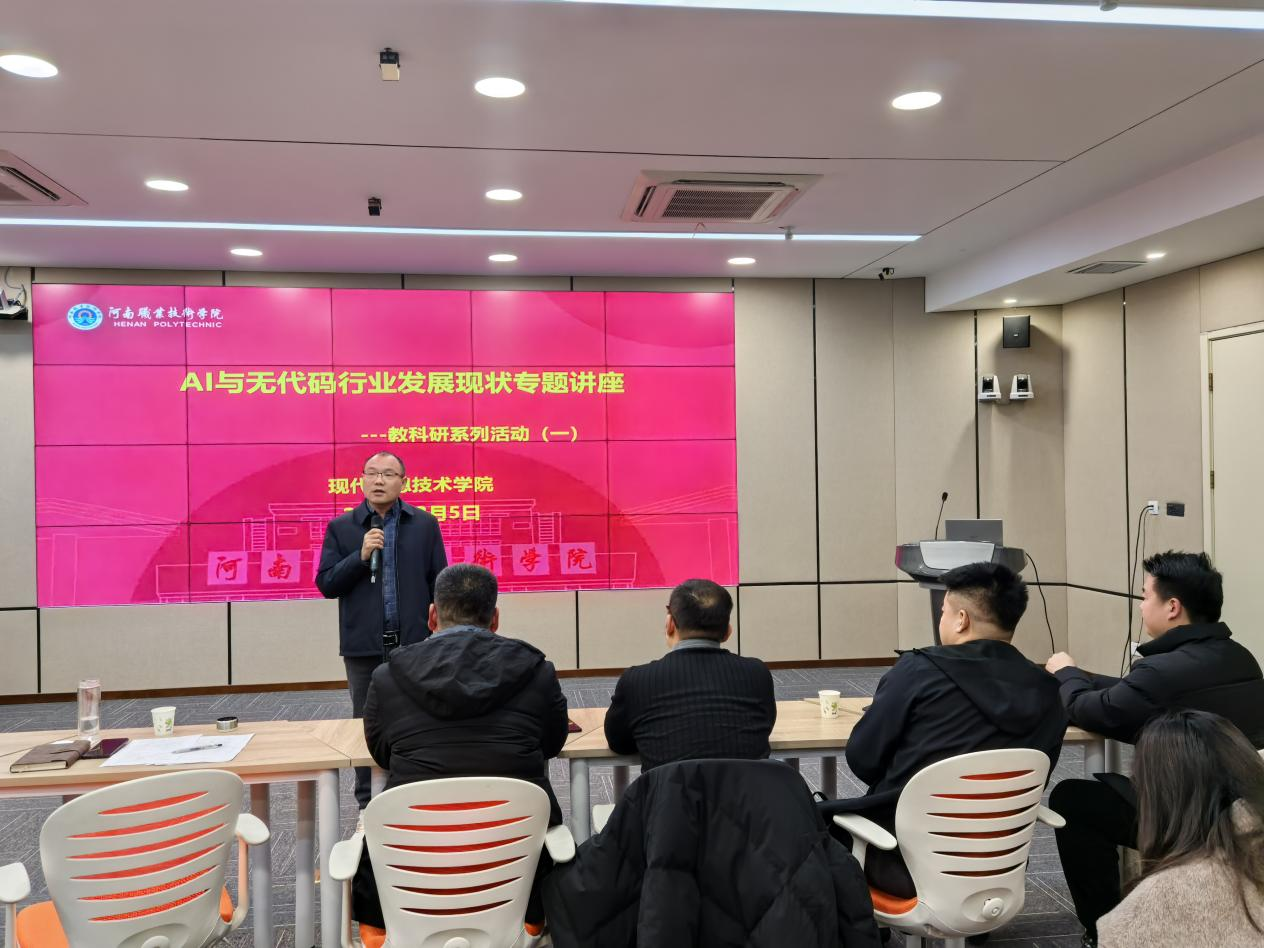 郭德威总监以《AI与无代码行业发展报告》为题,系统梳理了数字经济背景下AI与无代码技术的融合发展趋势。他指出,随着产业智能化进程加速,传统软件开发模式正被重塑,低代码、无代码平台正成为企业敏捷创新的关键工具。结合河南省数字经济发展规划,他深入剖析了当前行业面临的人才缺口与技术变革挑战,强调职业教育亟需转变观念,从“代码教学”向“AI思维+无代码编排能力”培养转型,为学院优化专业布局、提升人才培养质量提供了前瞻性指导。