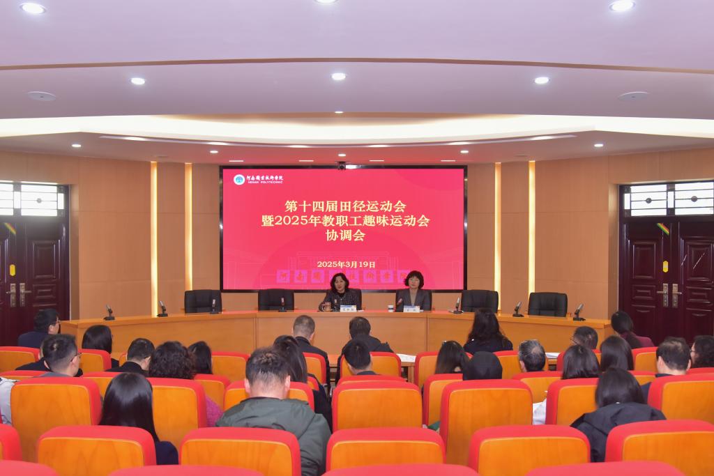 3月19日上午,河南职院召开第十四届田径运动会暨2025年教职工趣味运动会协调会,全面部署运动会筹备工作。校党委副书记、校长夏新颜出席会议并讲话。相关职能部门负责人,各二级学院党团工作负责人,音乐学院及基础教学部相关负责人参加会议。会议由校党委委员、副校长肖珑主持。
