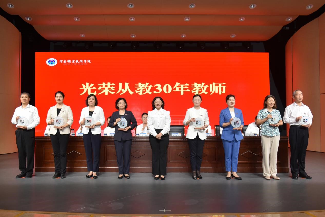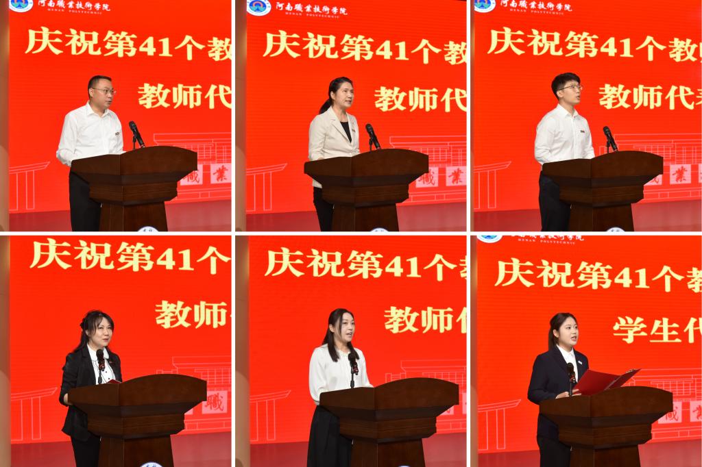 会上,校党委委员、副校长李玉峰宣读了河南省2025年优秀教师、2024年度河南省事业单位人员定期奖励“记功”教师、2022-2024年突出贡献人员、光荣从教30年教师、2024-2025年度“三育人”先进个人的相关表彰文件。校领导厉励、夏新颜、肖珑分别为受表彰教师颁发荣誉证书和纪念奖牌。刘拥军、王利琴、张一宁、童俊艳、王蕊等五位教师代表,结合自身工作成长经历,从科研创新、教书育人、管理服务等方面分享了心得体会;学生代表史文琪围绕自身求学经历表达了对师长关怀的感恩之情。随后,校党委副书记、校长夏新颜带领与会全体教职员工重温教师誓词,进一步坚定职业信念,增强责任感、使命感与荣誉感。